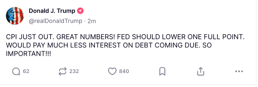 数据公布后,市场加大对美联储降息的押注,初步预计美联储今年将降息两次。美国总统特朗普在社交平台发文称,最新出炉的CPI数据很好,美联储应该整整降息一个百分点。